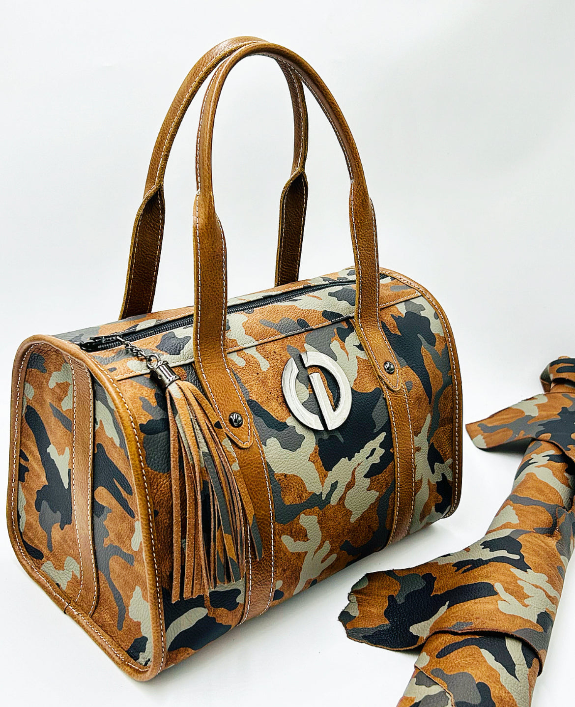 The Desert Storm Camo is a 1st class design with special attention to size and proportions. The Cuffed Boston Bag is completely handcrafted and assemble as a limited and exclusive article. The black, grey, and brown fatigue leather stands out as a unique fashion statement in and of itself. We designed this piece for the wow factor effect creating a conversation that furthers the brand's allure and attraction globally. We are dedicated to creating lifetime and lifestyle products that enhance the art of living.