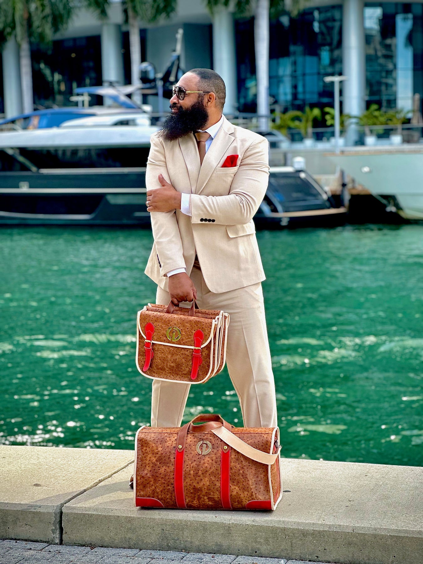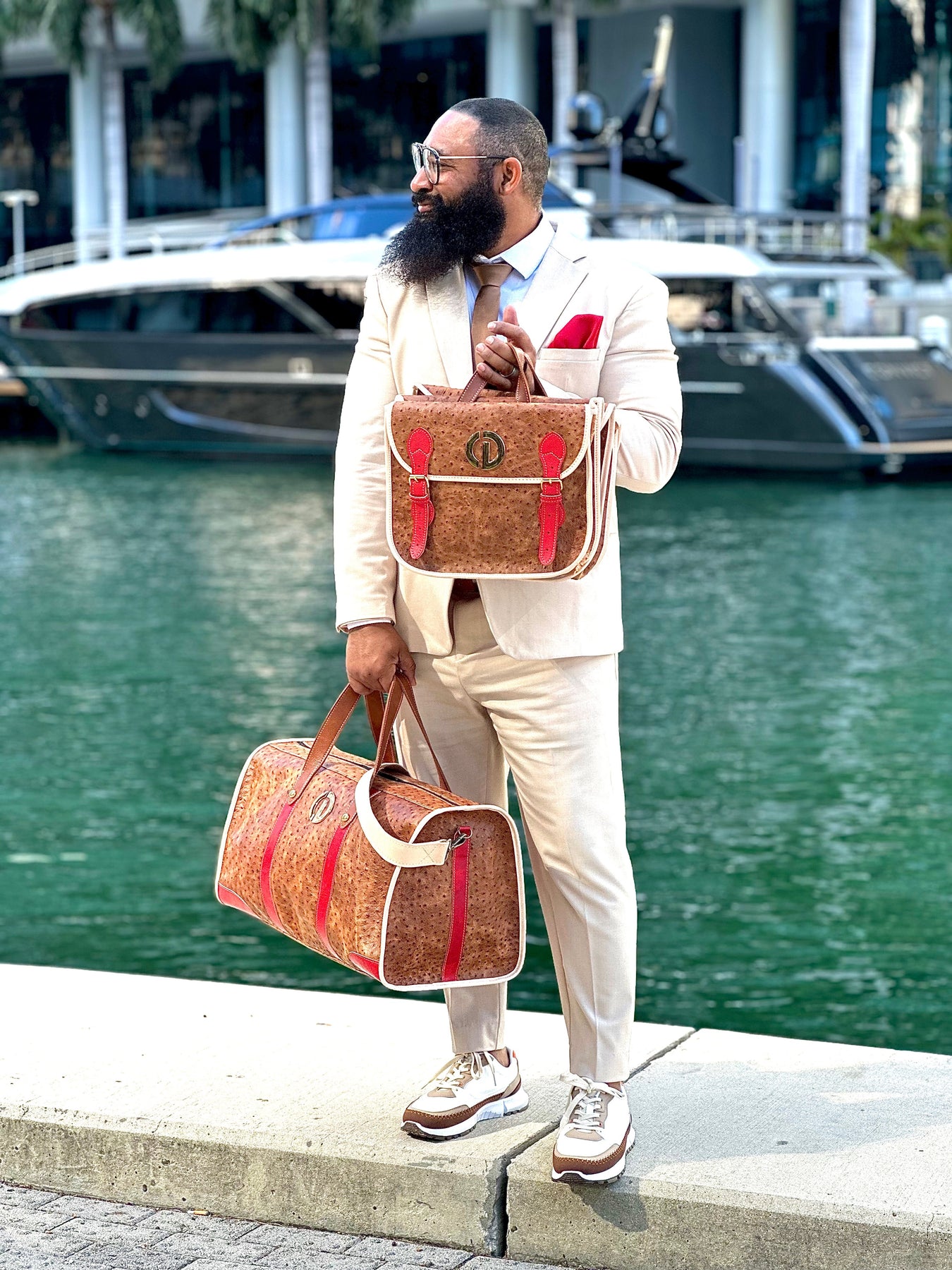 Bold, structured, and unmistakably End Zone Luxury, the Red Zone Saddle Bag merges classic design with modern-crafted precision. Its collapsible silhouette is formed from rich Brown Vintage Ostrich leather, paired with natural veg-tan trimming and the iconic Cherry Red accent straps that define this series.