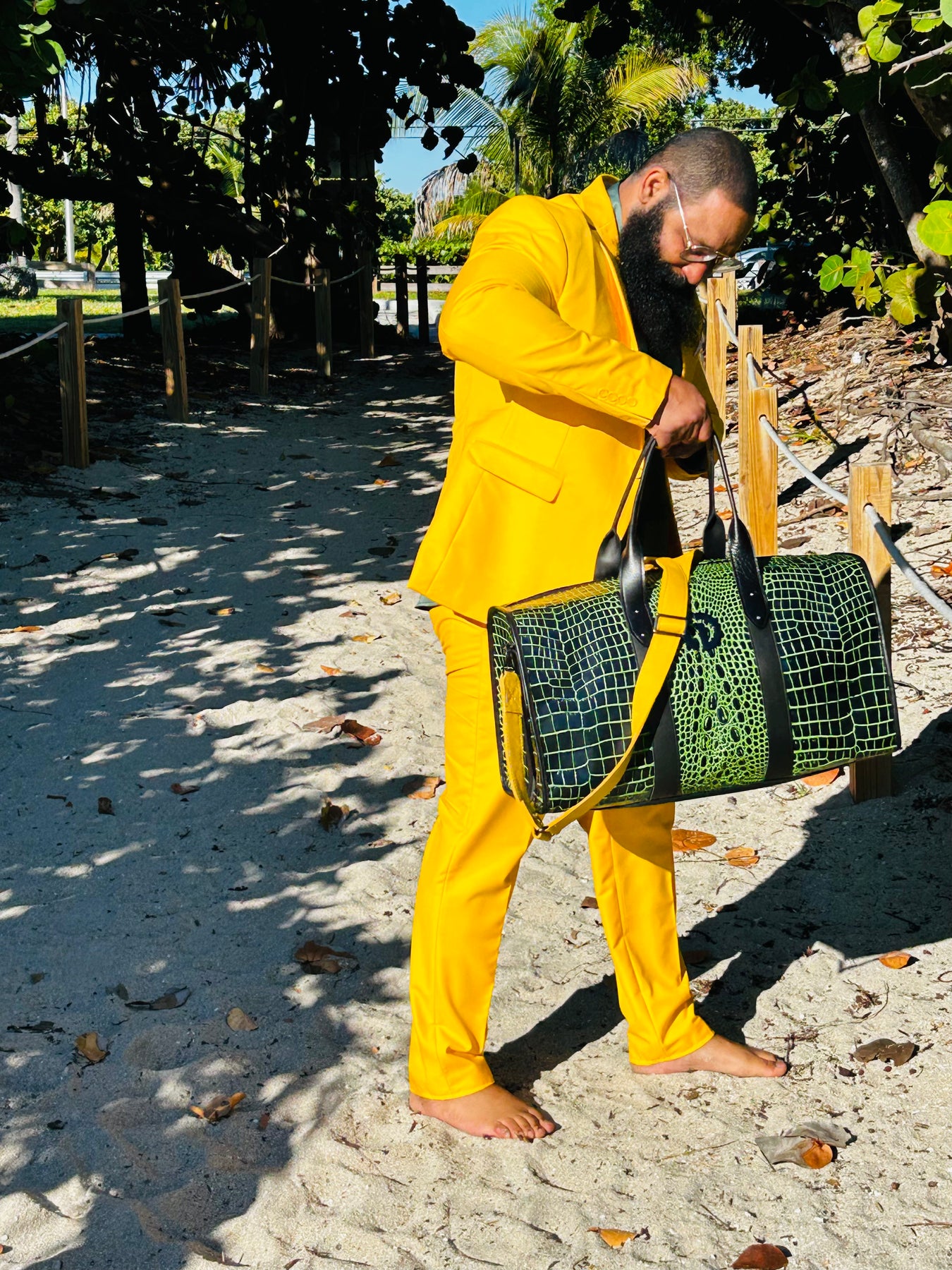 Crafted from Black-Lime Africana Crocodile leather and accented with Full Grain Chrome Tan Black leather, every panel reflects the balance between strength and elegance. The Cobalt Monte Carlo Black trimming adds a subtle depth, while the double-sided Mustard Pebble Leather shoulder strap introduces a distinctive contrast — a nod to individuality and refined edge.